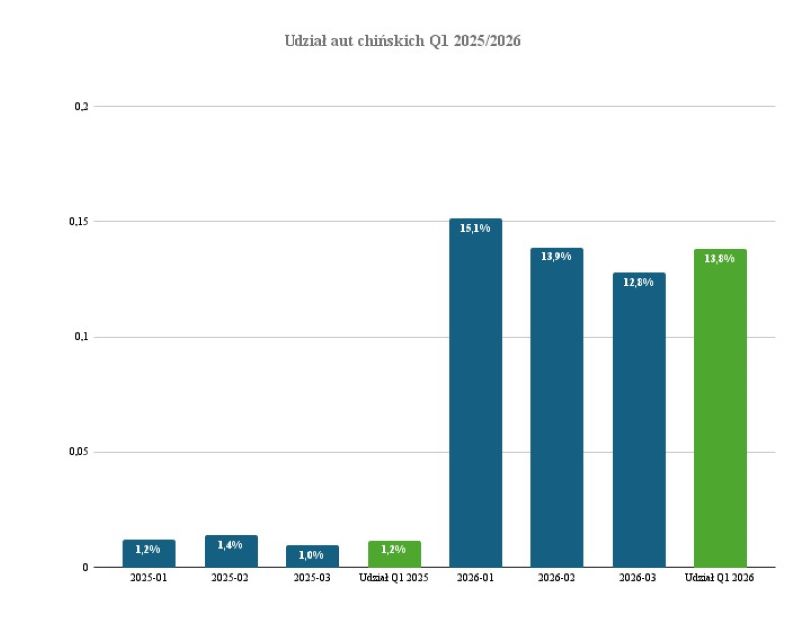 Na polskim rynku coraz wyraźniej widać też rosnącą rolę marek chińskich, choć sam wzrost ich udziału nie mówi jeszcze wszystkiego o zmianie rynku. Na początku roku udział chińskich producentów w rynku nowych samochodów osobowych wzrósł do 11,4 proc. Jednocześnie dane z systemów i analiz OTOMOTO Lease pokazują, że w analizowanej puli za pierwszy kwartał 2026 roku marki chińskie odpowiadały już za 13,8 proc. wolumenu, wobec 1,2 proc. rok wcześniej.