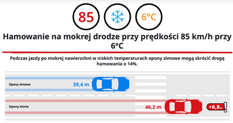 Różnica w drodze hamowania to 7 metrów na korzyść opon zimowych – czyli prawie 2 długości małego SUVa!
